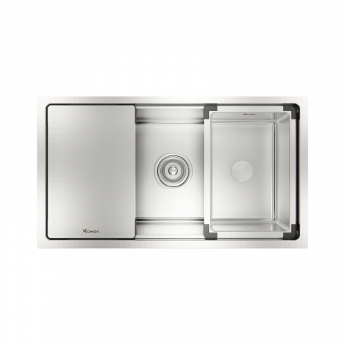 • Thiết kế hiện đại với gờ hạ bậc – tích hợp phụ kiện thông minh: Siphon, chậu rửa nhỏ, thớt inox