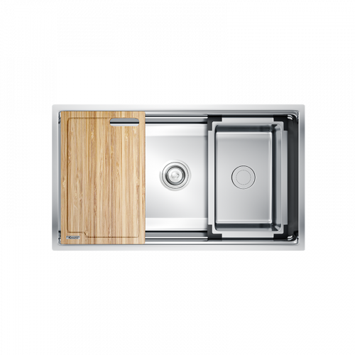 + Dòng chậu hạ bậc – tích hợp công năng: thớt gỗ, chậu rửa nhỏ